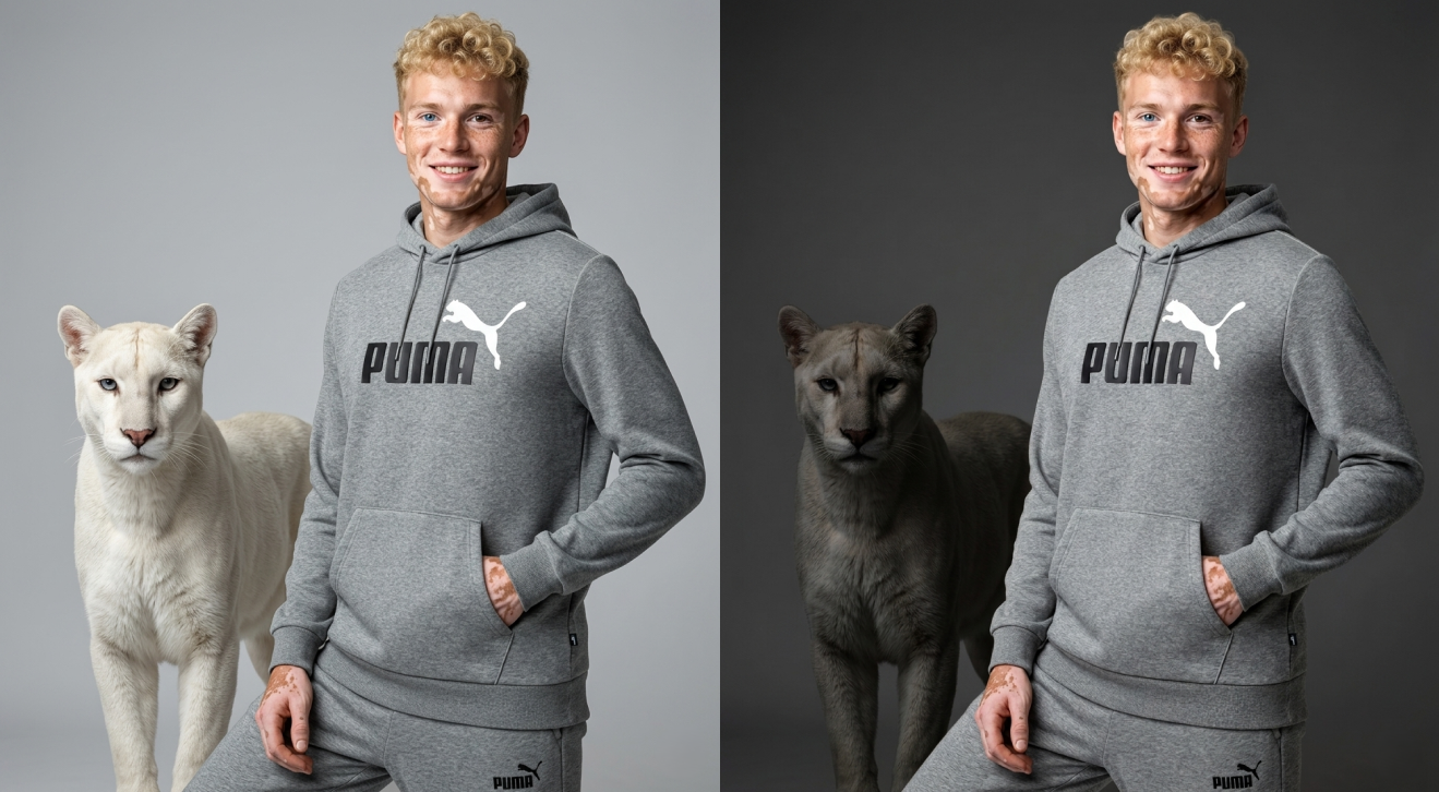 Из трендов сейчас - это люди с витилиго (пигментными меламиновыми пятнами), голубыми глазами, и в целом контрастной внешности. Толстовка у нас пума, поэтому мы решили добавить дополнительное привлечение внимания - белую пуму.