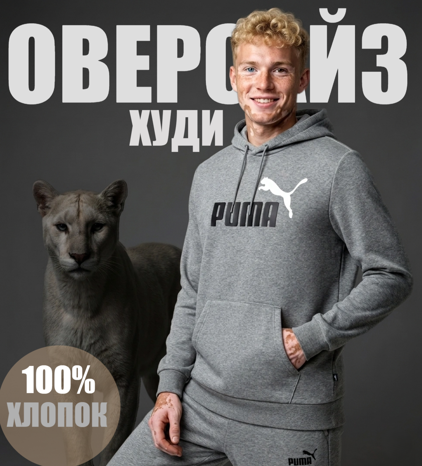 Используй референсное фото мужской толстовки (форма, цвет, надписи сохрани на 100%), но надень ее на красивого, молодого парня с выраженнными пигментными пятнами витилиго, белокурыми кудрявыми тонкими волосами (короткая стрижка), русской внешности, европеоидной внешности, у него гетерохромия ( правый глаз голубого оттенка, второй карий), добавь серые спортивные штаны в цвет толстовки с референса, модельная поза, взглад в камеру и живая улыбка, максимальный апскейл, отсутствие пластика, максимальная реалистичность и качество кожи, фон - серый студийный, рядом с парнем стоит белая реалистична пума.