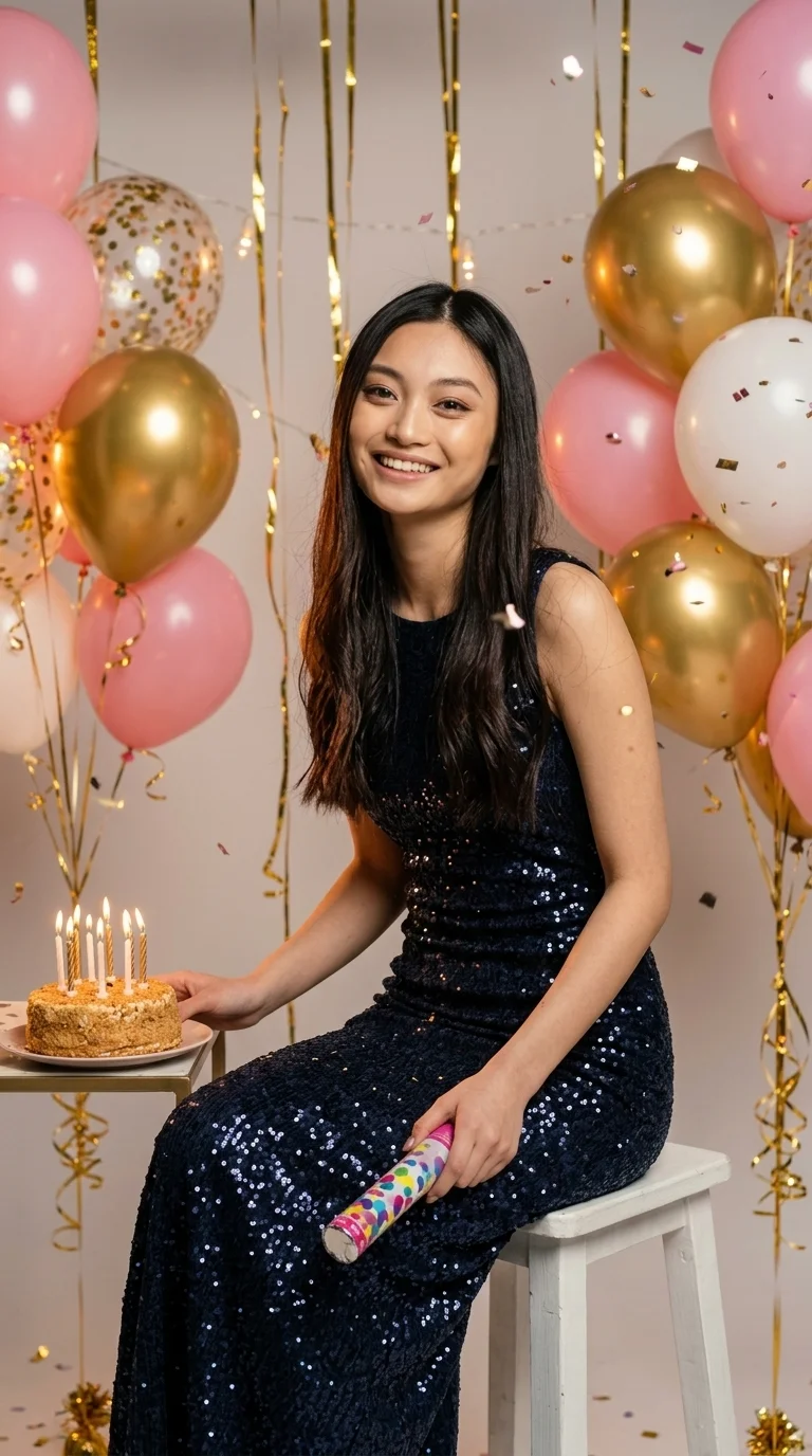 Праздничный стиль с тортом, свечами, воздушными шарами и блеском. Идеально, если нужно быстро создать атмосферу дня рождения — даже если сам праздник ещё не наступил.![]()