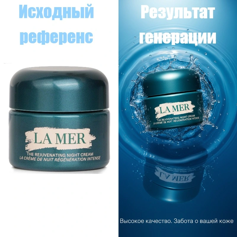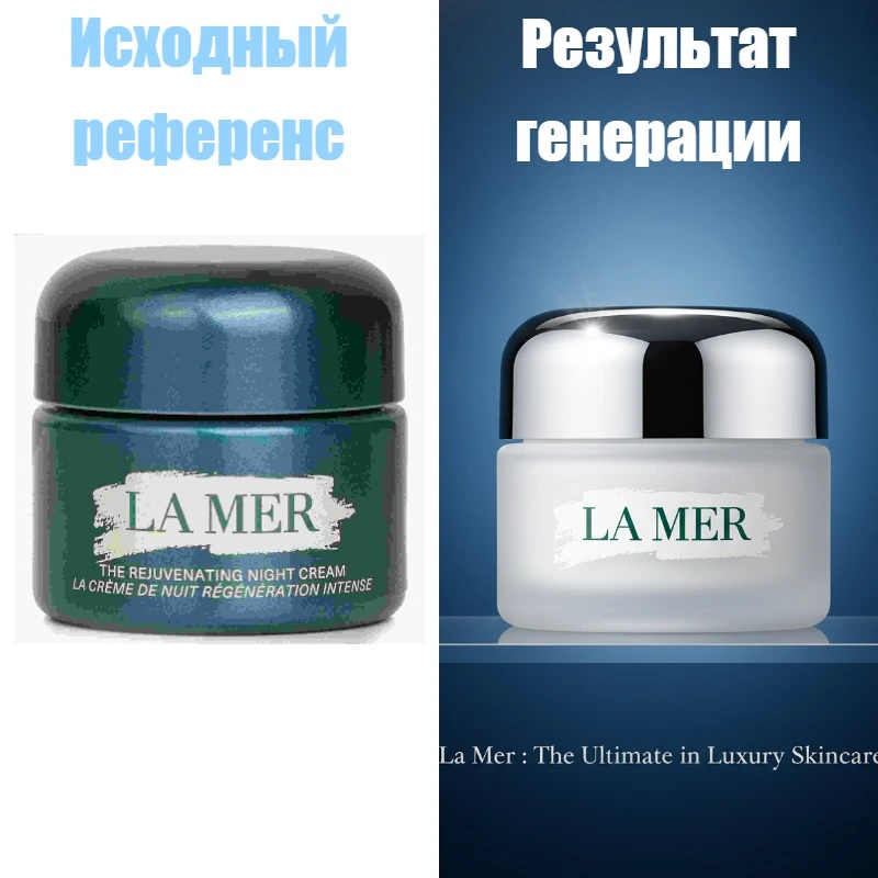 - Исходный промпт: сделай на голубом фоне рекламу на крем Ла Мер добавь текст что он очень люксовый и хороший сделай стильно