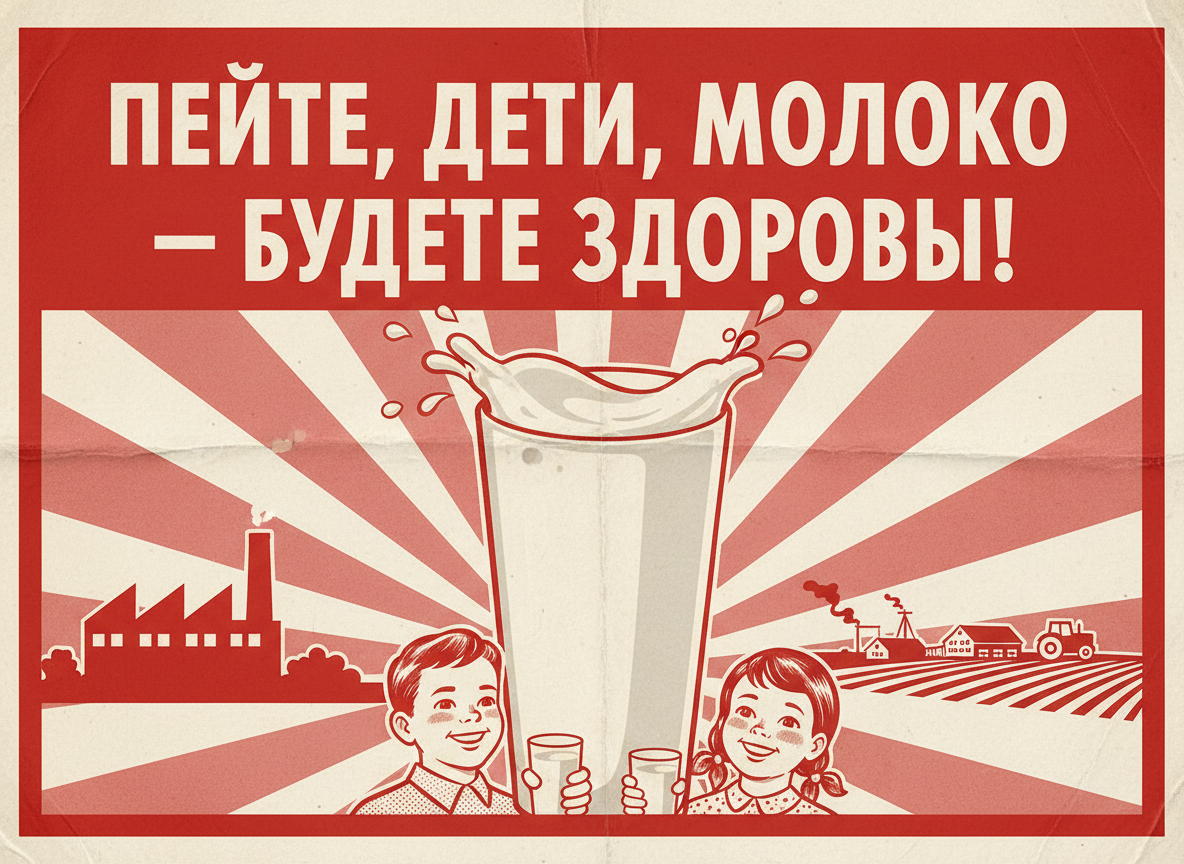 Prompt: Рекламный плакат в советском стиле ретро, пропагандистский, красно-белая цветовая гамма. В центре плаката — изображение стакана молока. Вверху плаката крупным, жирным, идеально выполненным кириллическим шрифтом написано: "ПЕЙТЕ, ДЕТИ, МОЛОКО — БУДЕТЕ ЗДОРОВЫ!". Текст четкий, легко читаемый, является неотъемлемой частью дизайна.