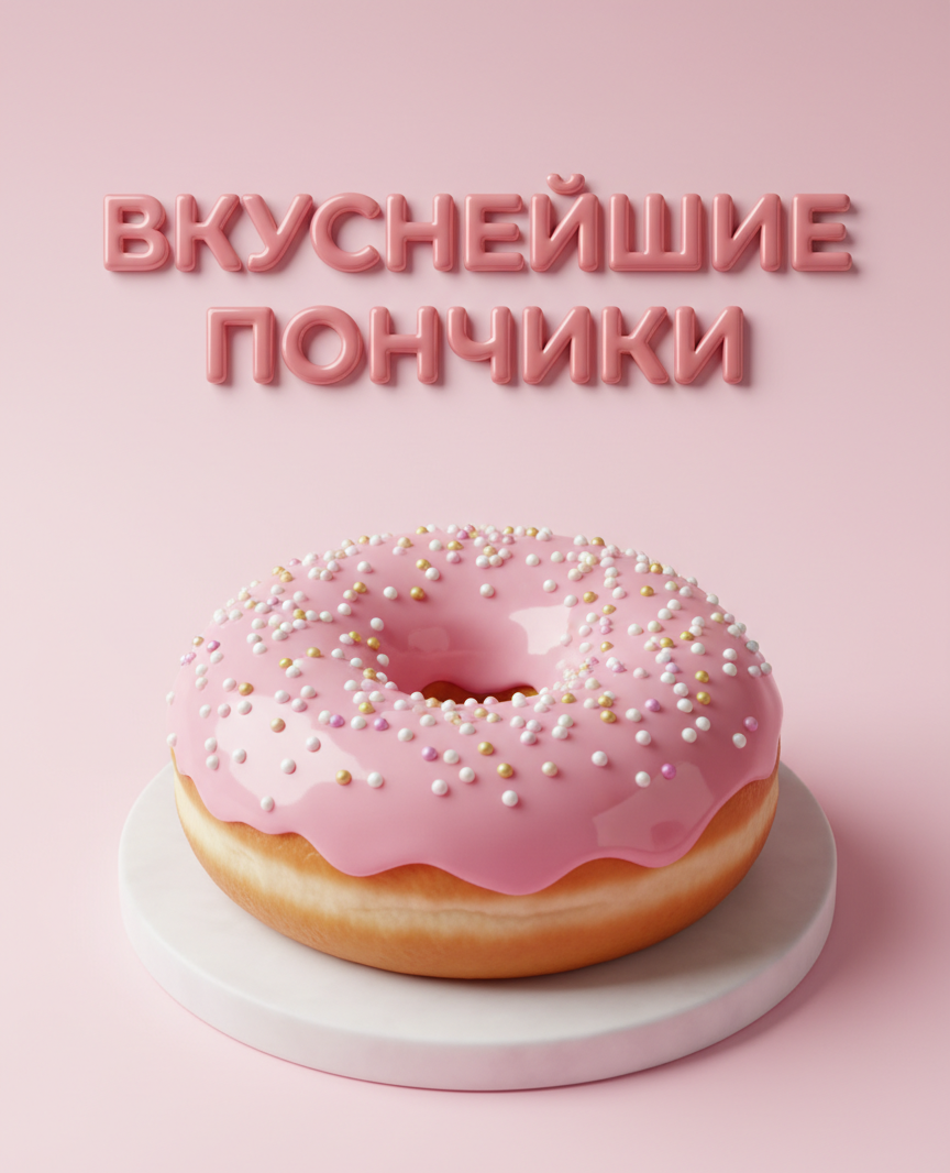 Шаг 2 (Текст, ВМЕСТЕ с контекстом): Большим, четким и жирным текстом кириллицей: “ВКУСНЕЙШИЕ ПОНЧИКИ”, объемные буквы, идеальная типографика.