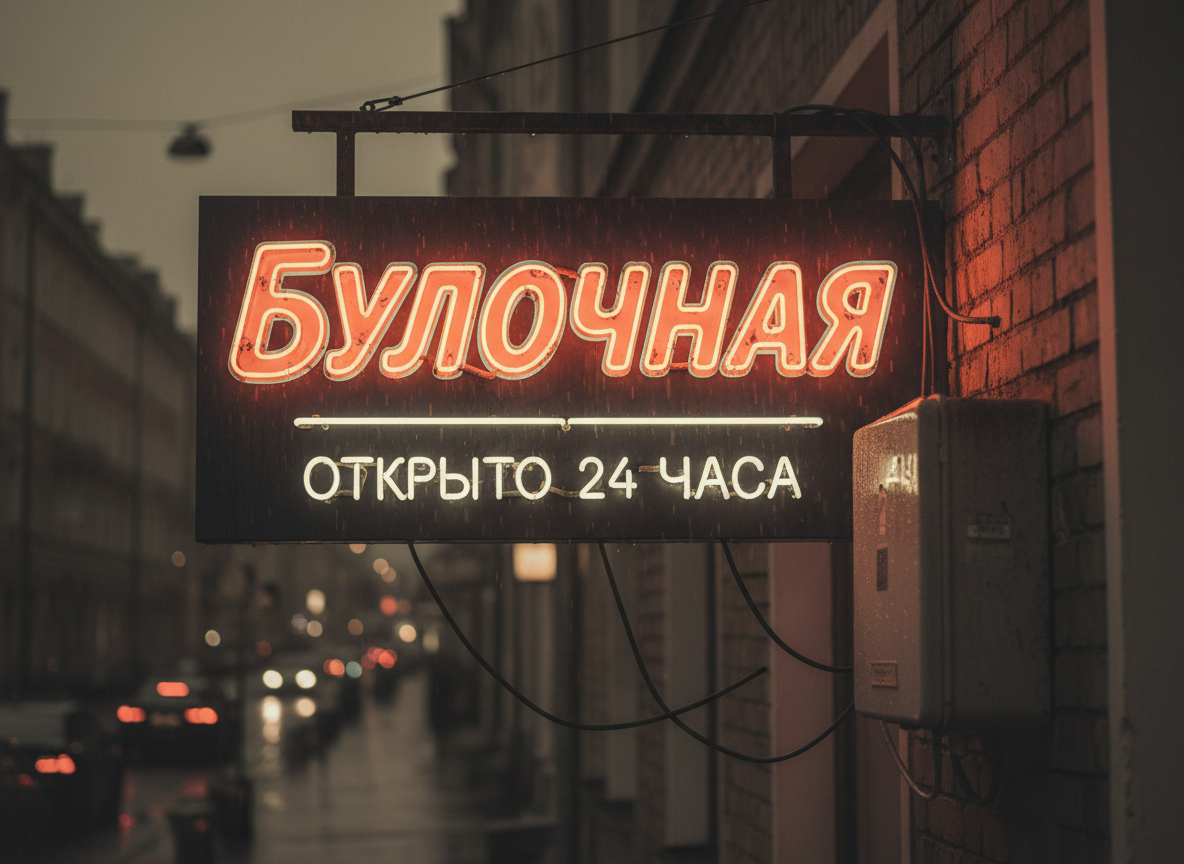 Prompt: Винтажная неоновая вывеска со светящимся текстом: “БУЛОЧНАЯ”. Текст написан кириллицей, четким шрифтом в стиле ретро.