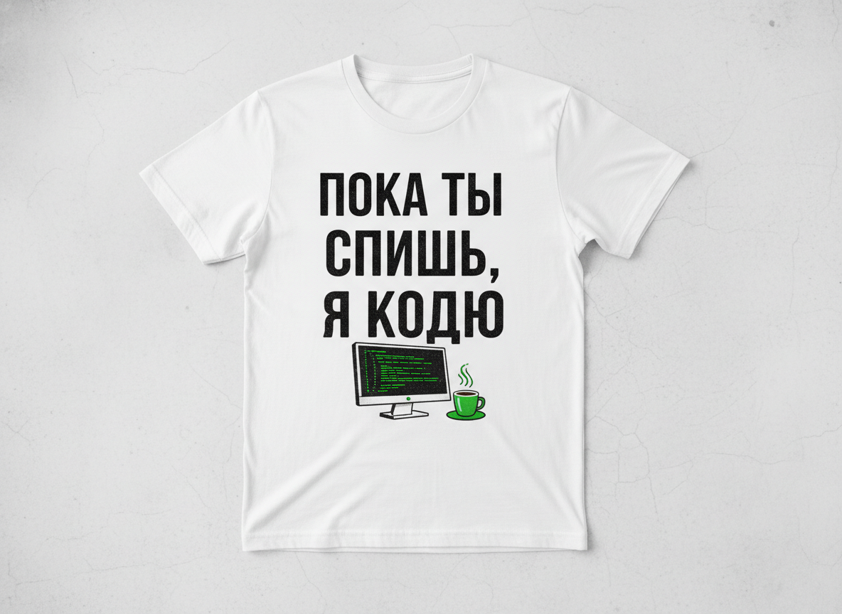 Prompt: Дизайн белой футболки в графическом стиле с крупным, четким и легко читаемым текстом, выполненным безупречной кириллицей: “ПОКА ТЫ СПИШЬ, Я КОДЮ”. Текст расположен по центру, жирным шрифтом, черными буквами.