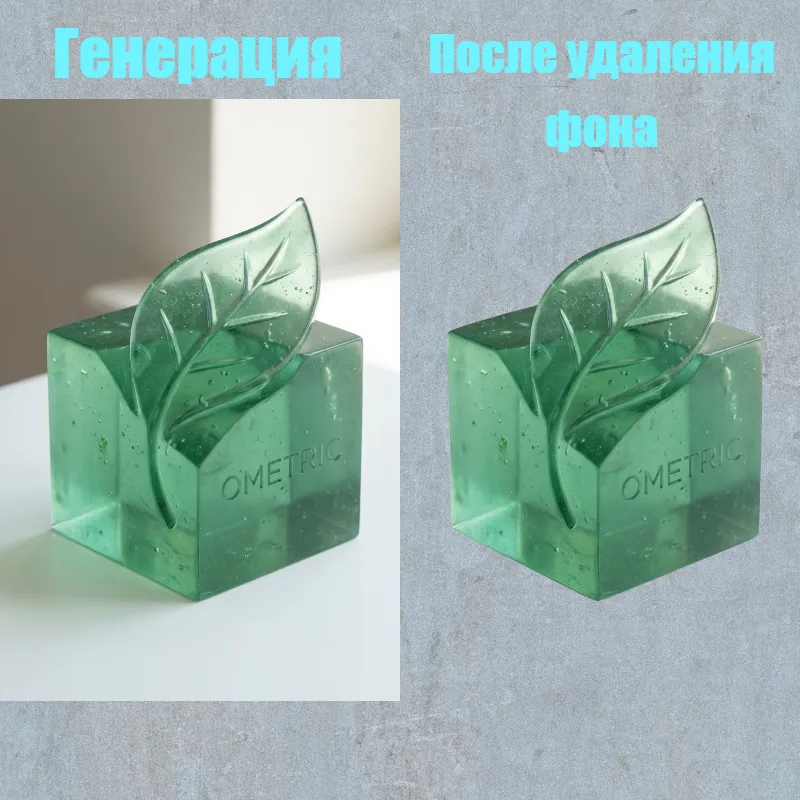 Prompt: Изометрический 3D логотип в виде листа, растущего из куба, выполненный из полупрозрачной смолы нефритово-зеленого цвета, естественный свет, биофильный дизайн, стильный бренд, фон - белый.