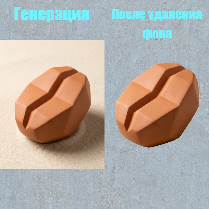 Prompt: 3D логотип, стилизованное кофейное зернышко, выполненное из матовой терракоты, мягкие тени, на светло-песочном фоне, ровное покрытие, геометрическая форма, тренд на "Дриблинг".