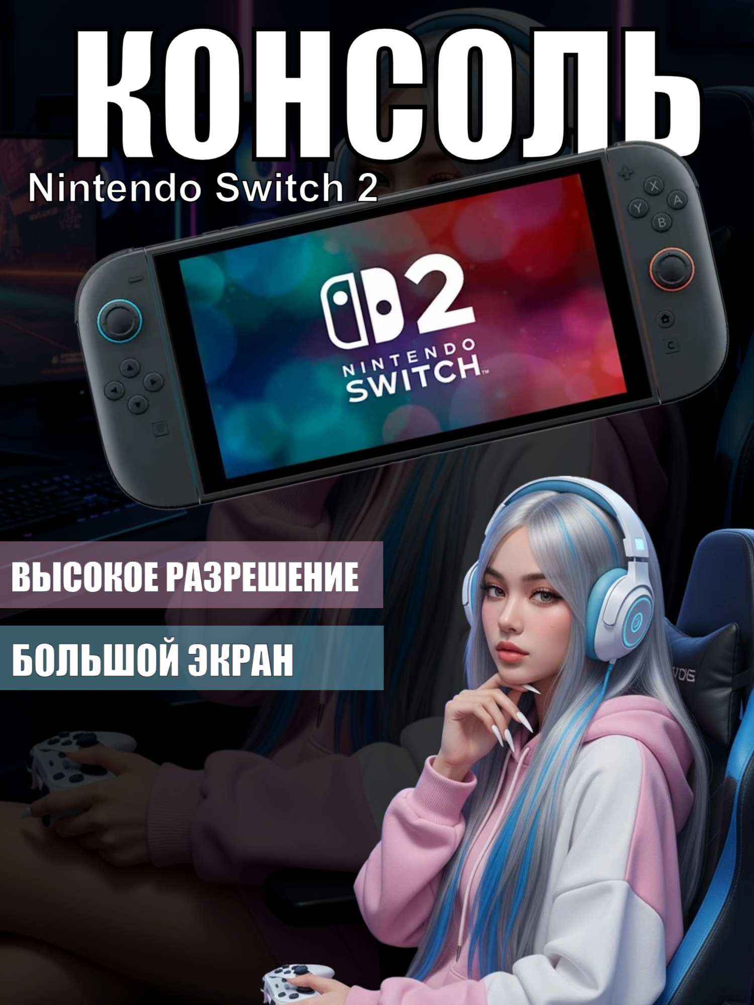 4. Добавили текст. Крупный «КОНСОЛЬ»-белый, жирный, на весь верх. Под ним «Nintendo Switch 2»-поменьше, аккуратный.