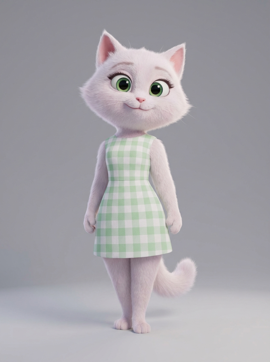 Красивая, изящная белая кошка (среднего возраста, ближе к молодой девушке) с яркими зелеными глазами и ресницами. Шерсть пушистая и мягкая белого цвета, будто припудренная. Кошечка стоит в полный рост в изящном коротком платье в белую и зеленую клеточку. Выражение мордочки — нежное, завораживающее, игривое. Стиль — современный мультипликационный персонаж в пастельных тонах, высокая детализация, проработка шерсти, одежды и кошки. Фон - серый студийный