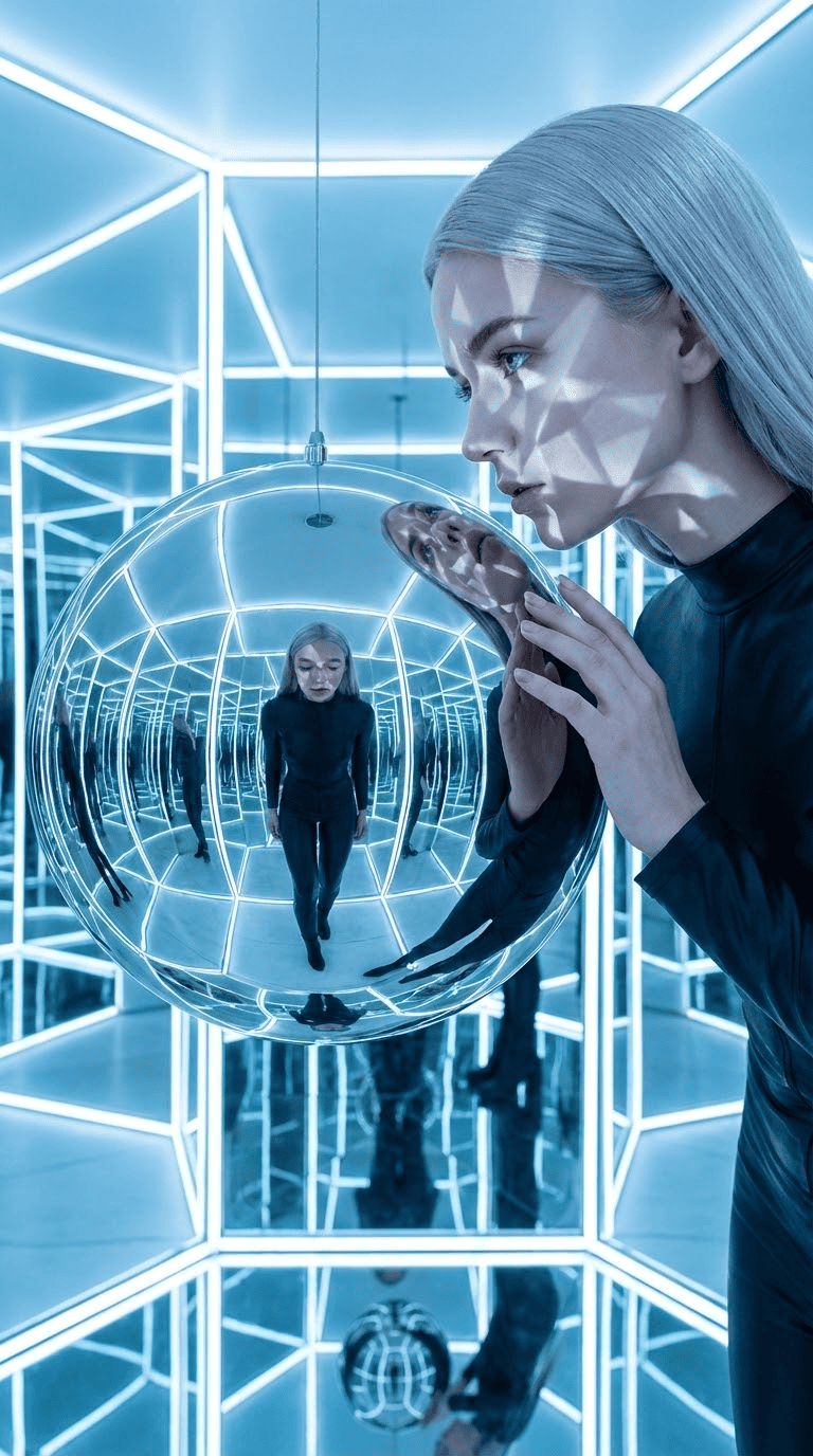 СФЕРИЧЕСКИЙ ПОРТРЕТ --ar 9:16 --style optical_illusion --no duplicate_reflections