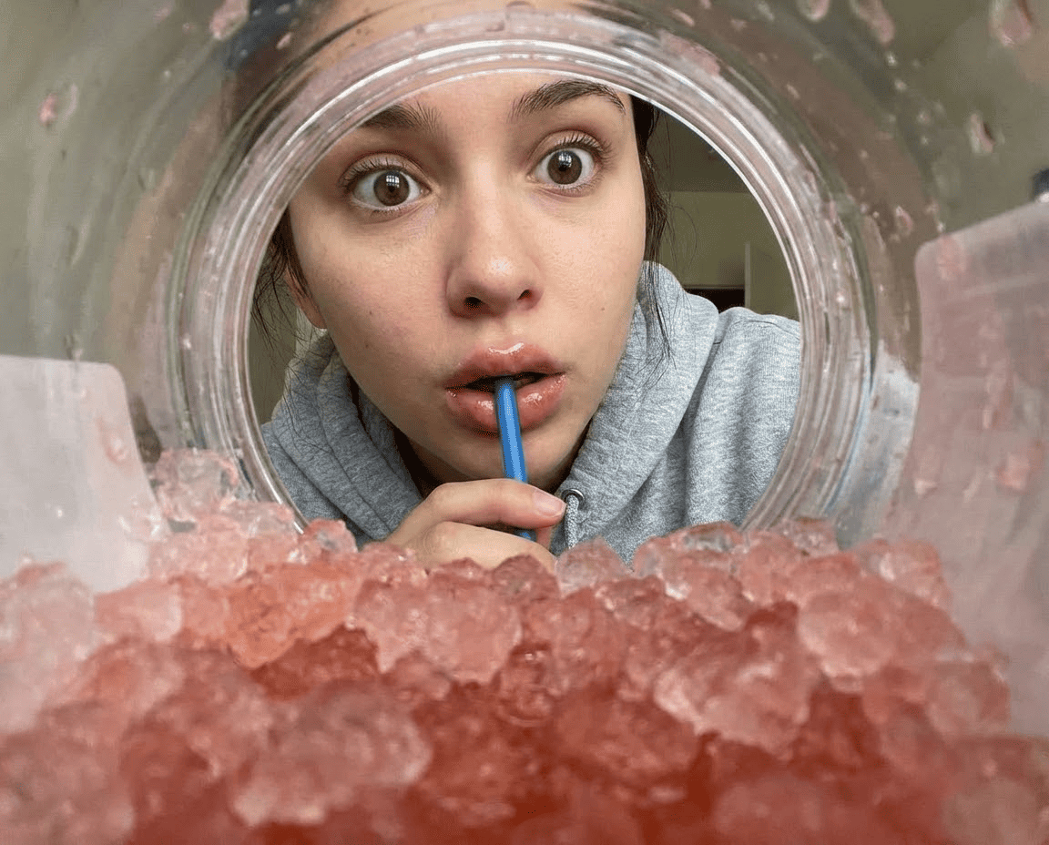 наполненного колотым розовым льдом. Молодая женщина склоняется над отверстием,