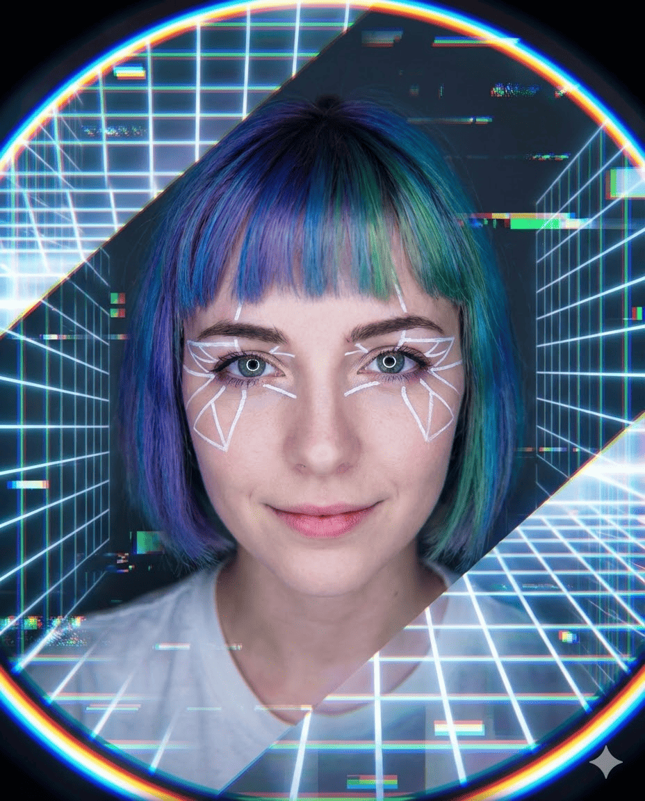 Тема: Девушка с геометрическим гримом (белые линии, расходящиеся от глаз), короткие разноцветные волосы