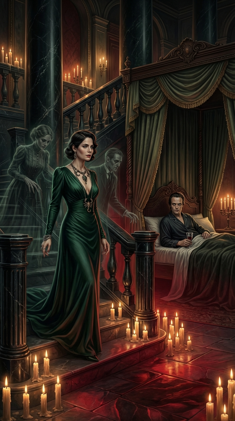 Prompt: Кинематографичная иллюстрация к книге в стиле фильма 2024 года. Сцена Великого бала у Сатаны. Маргарита — с чертами Юлии Снигирь — спускается по широкой мраморной лестнице в окружении колонн черного мрамора. На ней изумрудное платье с глубоким декольте, высокой талией и юбкой до пола, очень в духе 1930-х годов. В ушах — длинные серьги, на шее — тяжелое ожерелье, которое, согласно сюжету фильма, оживает и превращается в скорпионов (можно добавить этот элемент как тонкий намек) Вокруг Маргариты — полупрозрачные призрачные гости: казнокрады, фальшивомонетчики, сводницы, тянущие к ней руки. Справа на массивной кровати возлежит Воланд (типаж Аугуста Диля) в ночной рубашке, с бокалом в руке. Его взгляд прикован к Маргарите — смесь восхищения и ледяного спокойствия. Освещение — огни тысяч свечей, отражающиеся в мраморе, и багровые отсветы адского пламени из-под пола. Архитектура зала выполнена в стиле сталинского ампира, но с готическими нотками — смесь реального и потустороннего. Детализация: текстура мрамора, кружева на платье, блеск драгоценностей. Стиль — цифровой реализм с кинематографичной глубиной резкости. Цвета: изумрудный, черный, золотой, кроваво-красный.