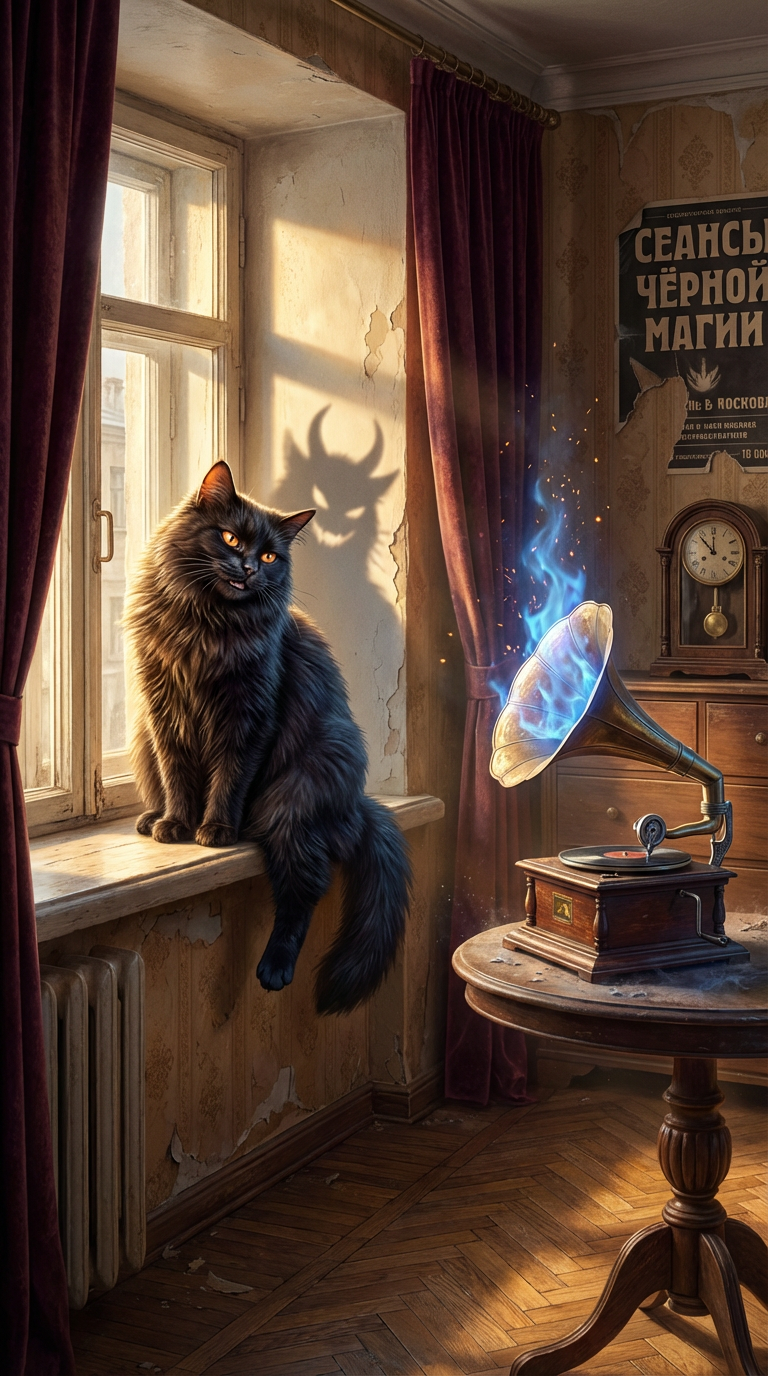 Солнечный свет из окна заливает комнату теплым золотым светом, создавая эффект контражура. Тень от кота на стене неестественно искажена: вместо кошачьего силуэта на стене отчетливо проступает рогатая дьявольская тень с острыми плечами — явный признак потусторонней природы персонажа.