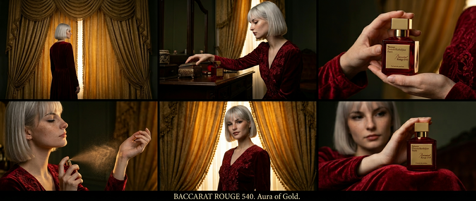Наш промпт: Создай тематический сториборд для видеоролика из 6 кадров, размером 1/1. Модель на фото в точности, как на референсе (волосы, лицо, тело). Надень девушке красное детализированное бархатное платье. Фон - комната с золотыми шторами викторианской эпохи. Продукт для рекламы на втором фото (духи), сохрани их форму, цвет надписи идентичными. Высокая детализация, тематический ролик, глубокие тени, живая кожа, эффектная реклама.