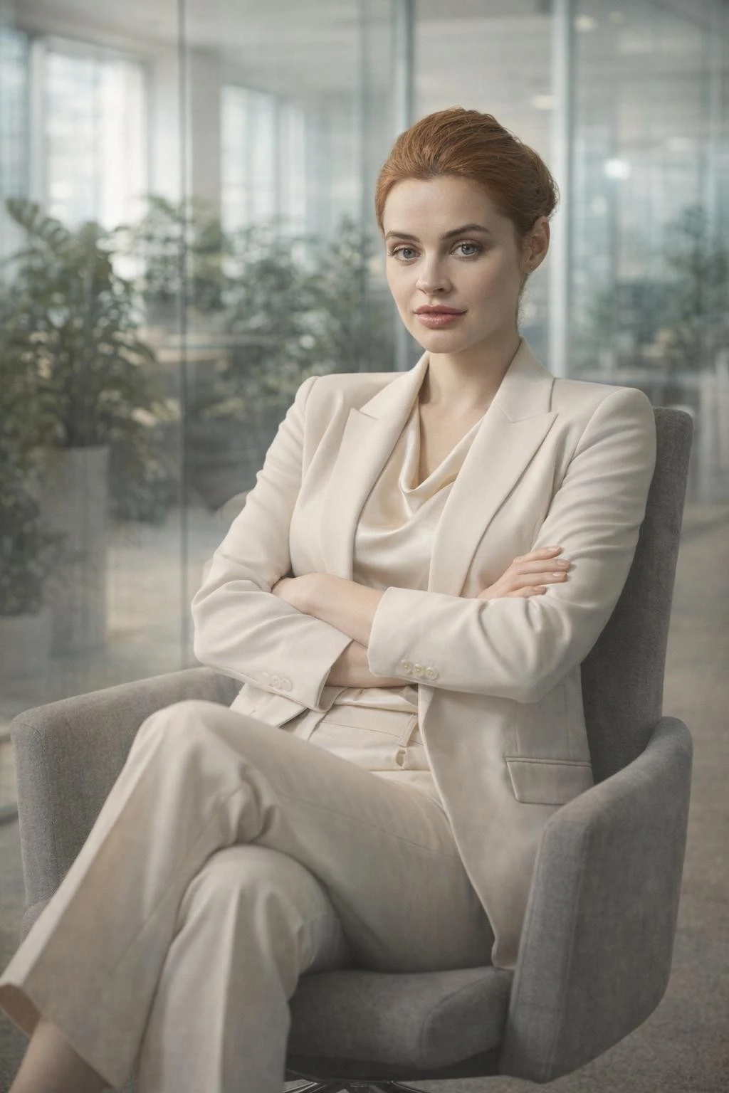 Девушка (Лицо, волосы, тело, как на фото women. png) в элегантном деловом костюме: жакет и брюки прямого кроя цвета слоновой кости, под жакетом — шёлковая блуза с лёгким блеском. Волосы собраны в гладкий пучок. Современный светлый офис с живыми растениями на заднем плане и стеклянными перегородками. Девушка сидит в кресле, нога на ногу, руки сложены, открытый взгляд Освещение: мягкий дневной свет из больших окон, заполняющий свет спереди. Детализация: текстура шёлка, фактура костюма, естественный макияж, лёгкий блеск губ. Тёплый тон кожи. Кинематографичная цветокоррекция, лёгкая дымка.