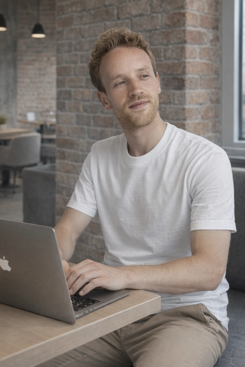 Мужчина (лицо, волосы, как на фото man. jpg) в стильном повседневно-деловом образе: тёмно-серый пиджак с мягкой фактурой, белая футболка из плотного хлопка вместо рубашки, классические брюки чинос. Фон — современный лофт-коворкинг с кирпичной стеной и макбуком на столе. Мужчина сидит в кресле, руки на столе. Выражение лица дружелюбное, но собранное. Освещение мягкое, студийное + естественный свет из окна. Детали: фактура джинсовой ткани, отражения в ноутбуке, текстура кирпича. Стиль: современная коммерческая фотография, глубина резкости.