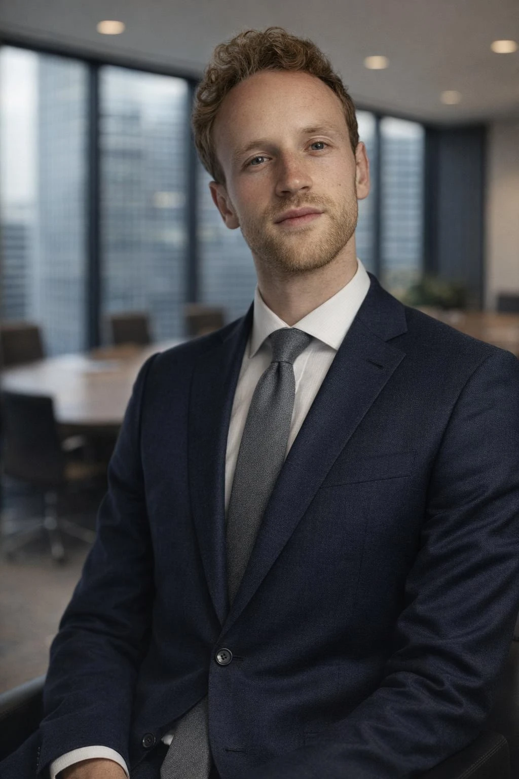Фотореалистичный портрет молодого мужчины (лицо, волосы, тело, как на фото man. jpg) в современном деловом костюме. На нём идеально сидящий тёмно-синий пиджак из тонкой шерсти, белая рубашка с текстурой, серый галстук с аккуратным узлом. Поза деловая, строгая, офисная, лицо направлено в камеру, серезное. Фон — стильная переговорная с панорамными окнами и размытым видом на деловой центр. Естественное освещение из окон + мягкий верхний свет. Взгляд уверенный, спокойный. Детализация: фактура ткани, микро-морщинки на пиджаке, лёгкие тени на лице. Кинематографичный цвет, тёплый оттенок кожи. Техника: цифровой реализм, 8k.