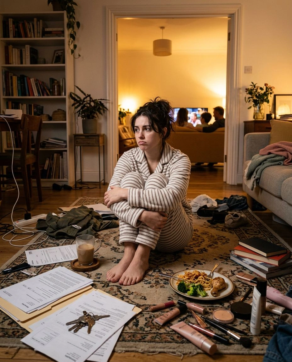 Промпт: Квартира, вечер, бардак, на полу разбросаны взрослые вещи — документы, ключи, косметика, недопитый кофе. Посреди этого хаоса на ковре сидит взрослая девушка в пижаме, обняв колени и надув губы, как обиженный ребенок. Рядом с ней стоит тарелка с недоеденной едой, которую ей явно кто-то приготовил (родители или партнёр). Она смотрит в одну точку, отказываясь разговаривать. На заднем плане видно приоткрытую дверь в комнату, откуда льется тёплый свет и слышны звуки работающего телевизора — там её семья, которая оставили её в покое, устав от капризов. Контраст между "я взрослая самостоятельная женщина" и "я маленькая девочка, которую все должны жалеть". Уютная, но напряженная атмосфера, домашний свет, фотореализм, высокая детализация, 8к.