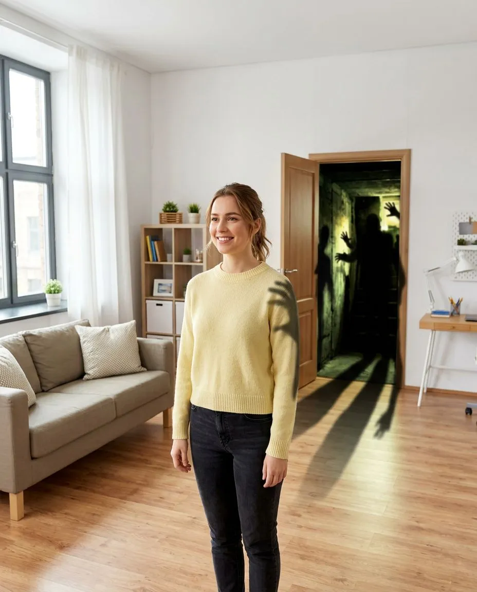 Промпт: Девушка стоит в чистой светлой комнате с идеальным порядком. Она улыбается, всё прекрасно. Но за её спиной — приоткрытая дверь в тёмный подвал, откуда пробивается тревожный свет, тянутся тени и странные силуэты. Она делает вид, что двери не существует, но тени уже касаются её плеч.