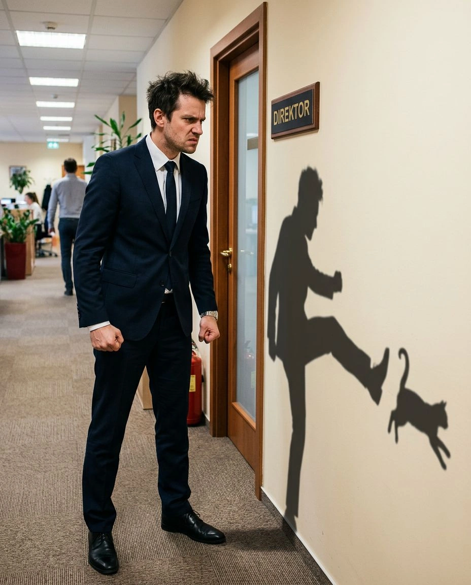 Промпт: Офисный работник в костюме сжимает кулаки и злобно смотрит на закрытую дверь кабинета с табличкой "Директор". А его тень на стене показывает совсем другую картину: тень пинает маленького кота. Реальность приличная, тень — честная.