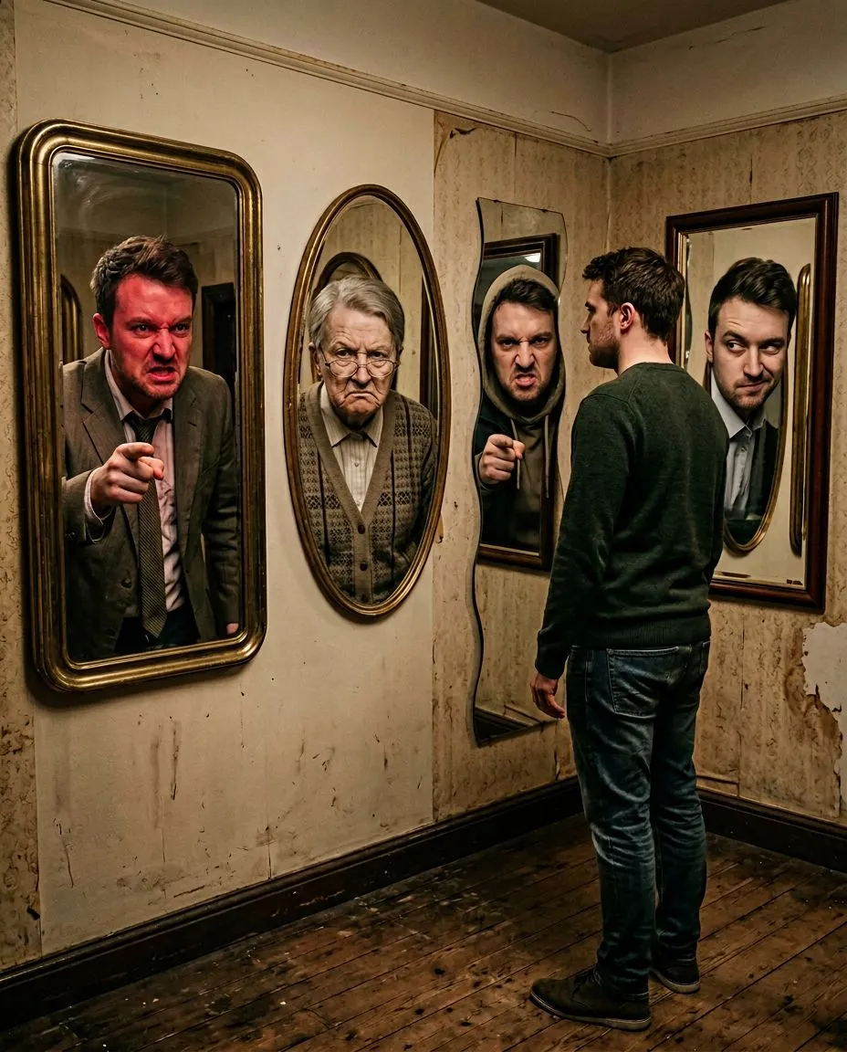 Промпт: Человек стоит перед комнатой кривых зеркал. В каждом отражении — разные люди: злой начальник, осуждающая старушка, агрессивный прохожий, завистливый коллега. Но если присмотреться, у всех этих отражений лицо самого человека. Он смотрит на других, а видит — себя.