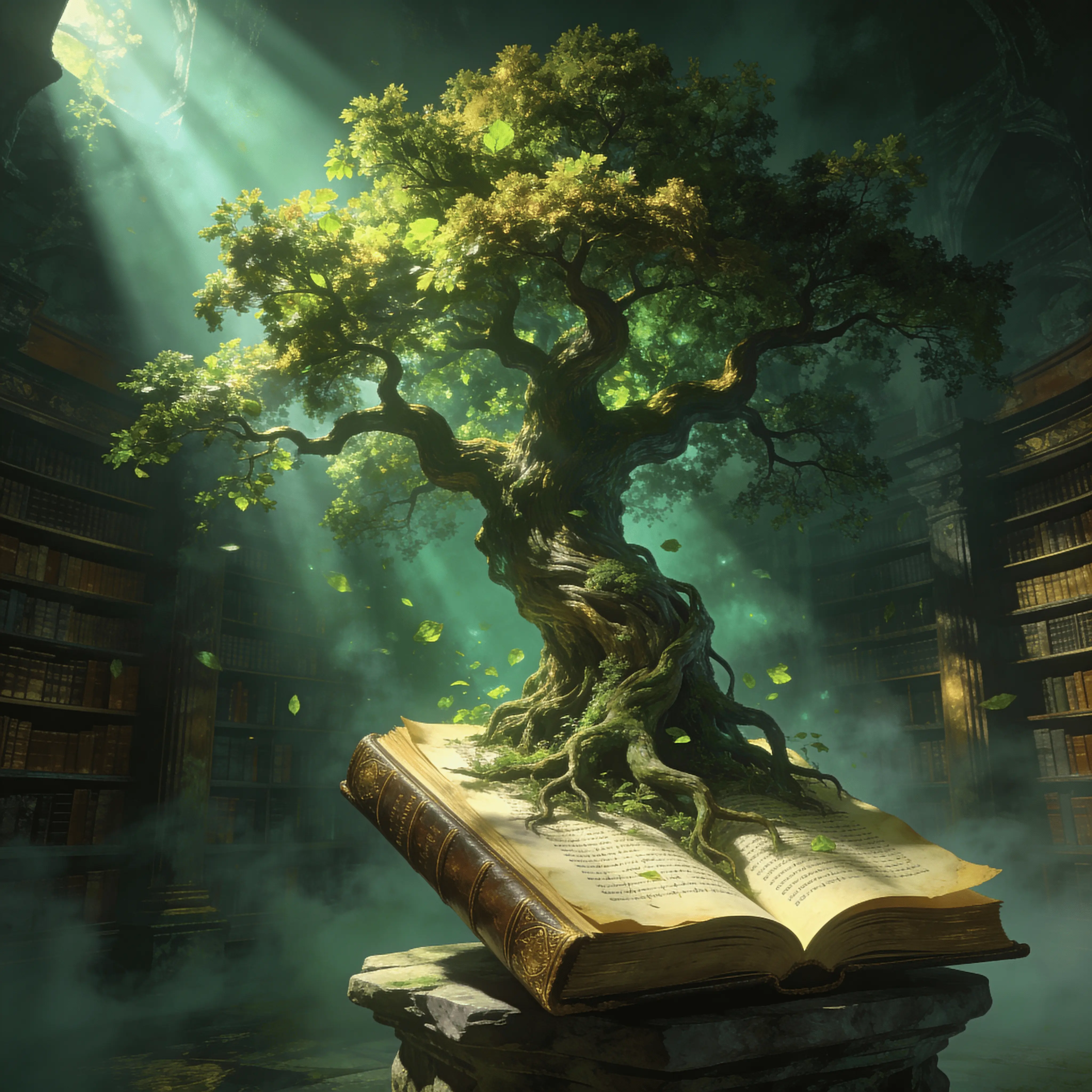Дерево, растущее из раскрытой книги, сюрреалистичный стиль, детализированная иллюстрация, насыщенные цвета, драматическое верхнее освещение.