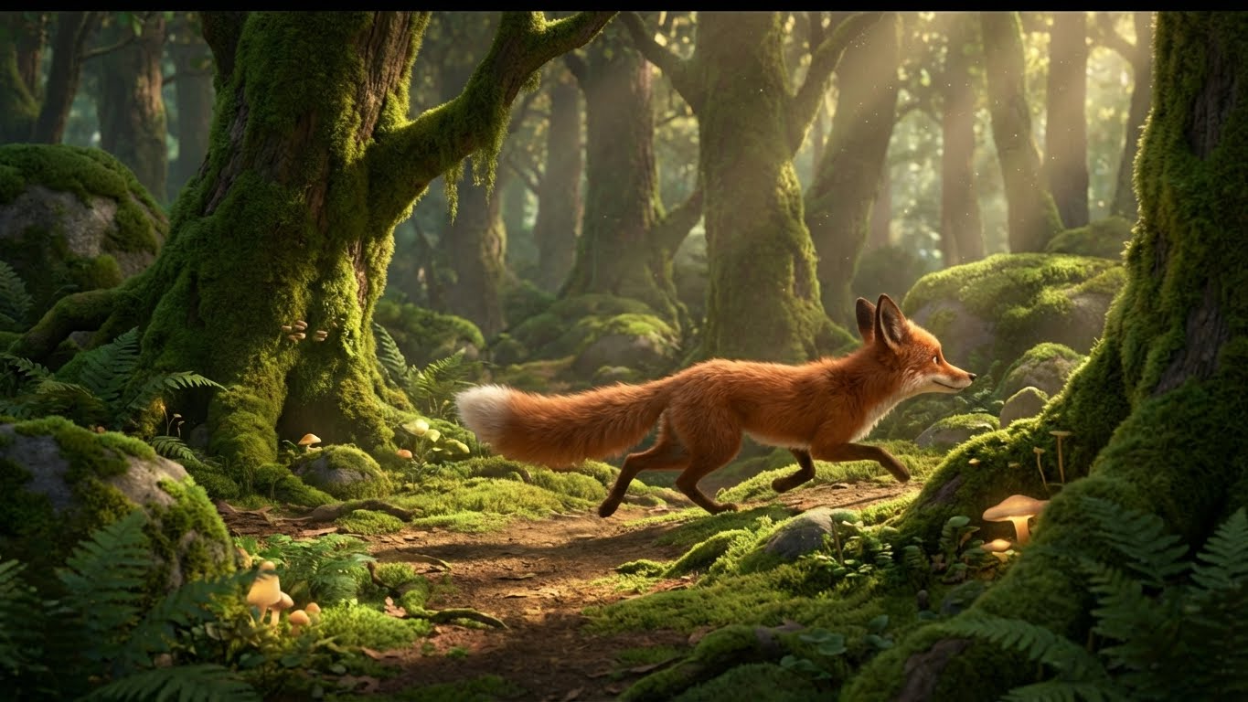 Ракурс: Камера движется за лисом на одном уровне, создавая эффект присутствия и вовлеченности.